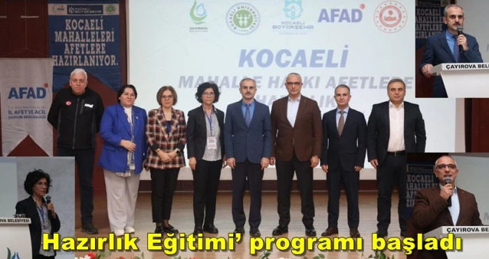 Çayırova’da afetlere karşı ilçe sakinlerini bilinçlendirme çalışmaları tüm hızıyla devam ediyor. Bu bağlamda Kocaeli Büyükşehir Belediyesi, AFAD ve Kocaeli Üniversitesi’nin iş birliğinde gerçekleştirilen ‘Mahalle Halkı Afetlere Hazırlık Eğitimi Projesi’ Çayırova’da başladı. Çayırova Belediyesi’nin ev sahipliğinde düzenlenen ve ilçe bazında 10’uncusu düzenlenen eğitimler, iki gün sürecek. Çayırova Belediyesi Kültür Merkezi’nde düzenlenen programa Çayırova Belediye Başkanı Bünyamin Çiftçi, Kocaeli Büyükşehir Belediye Başkanvekili Hasan Soba, muhtarlar ve vatandaşlar katılım sağladı.
